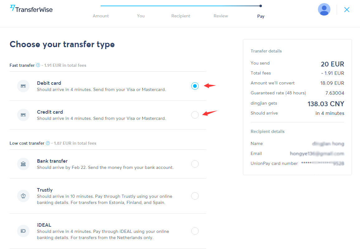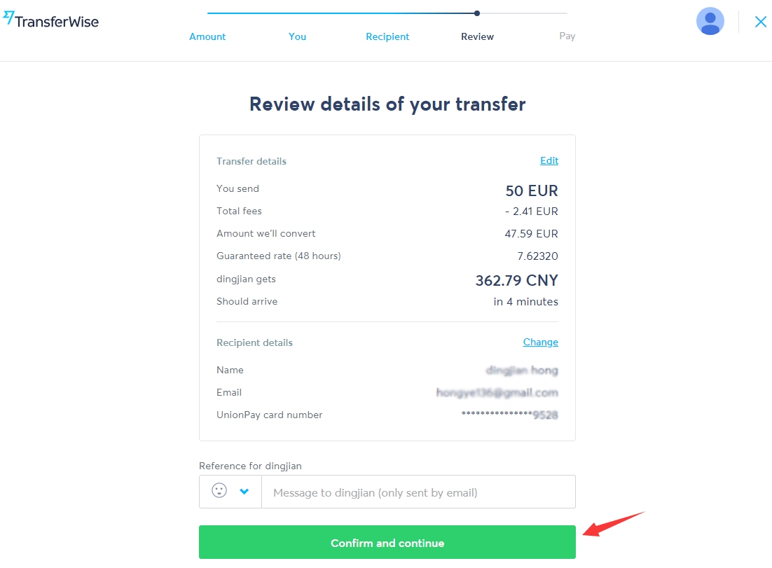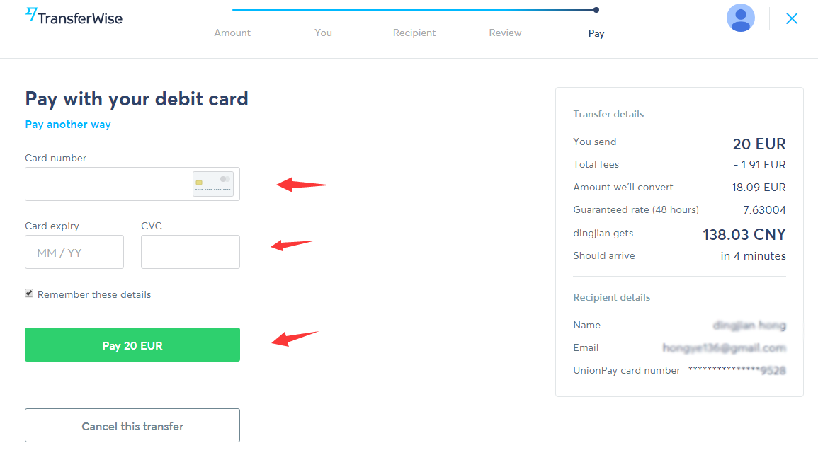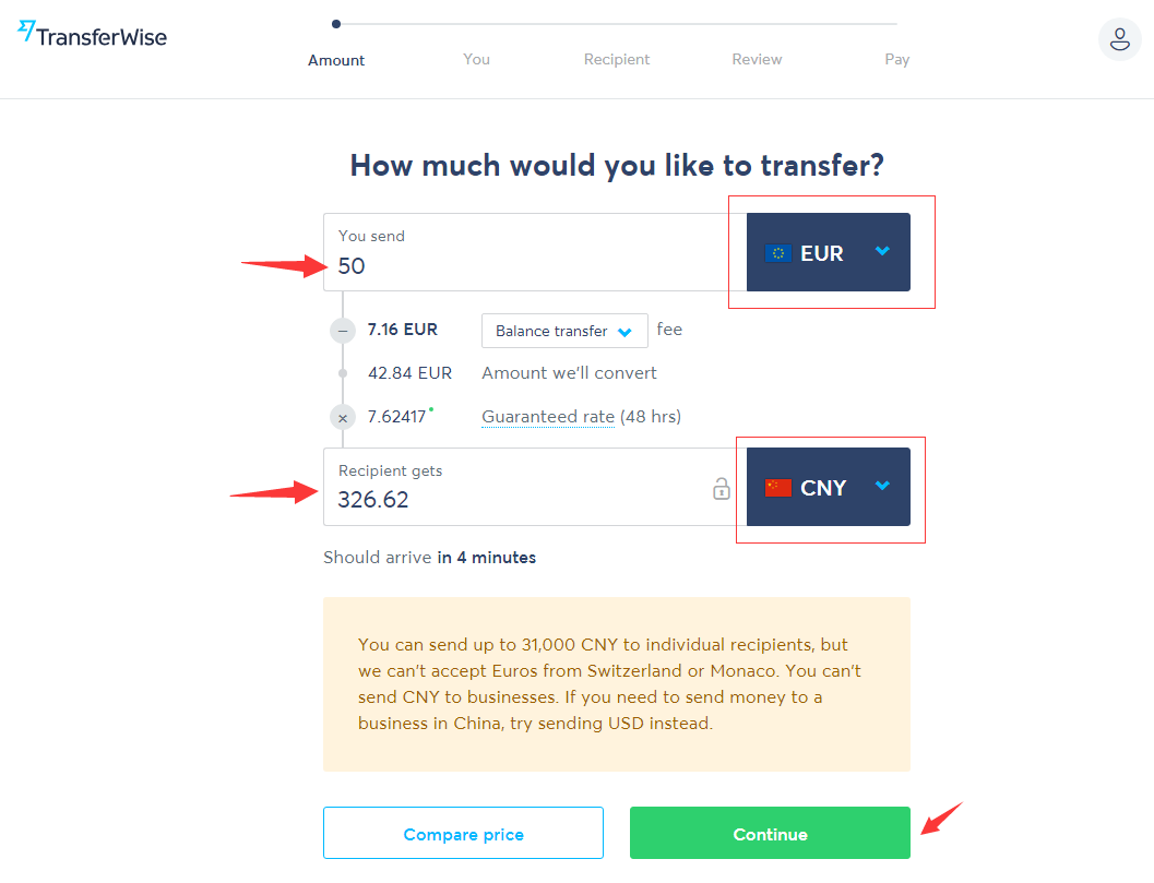 PASSAGGIO 2: immettere i valori dell'ordine in EUR e attendere CNY per il destinatario